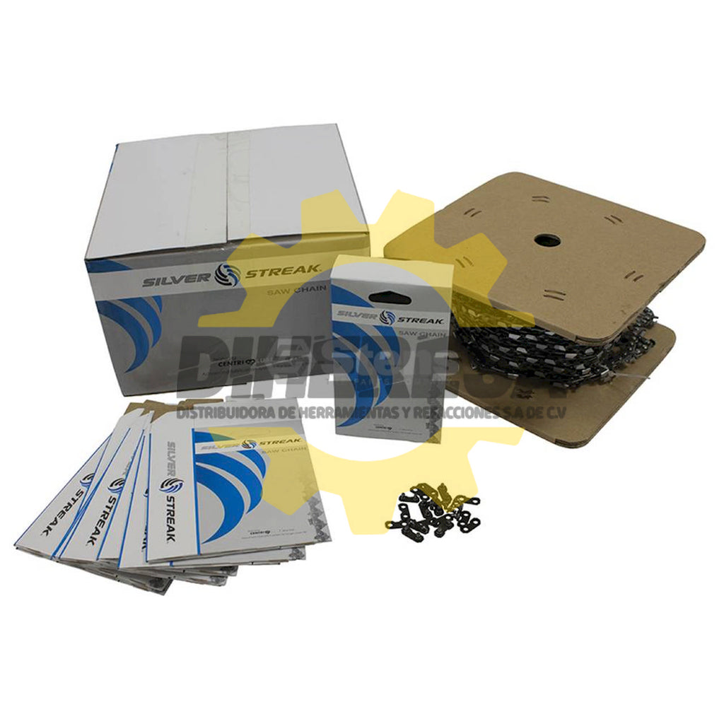 Duración: 25', el embalaje Tipo: Branded caja, Tipo: Semi-cincel estándar, Incluye correas laterales, correas preestablecidos y 10 cajas de bucle precortadas, el tono : 3/8" , motosierra Calibre: .058